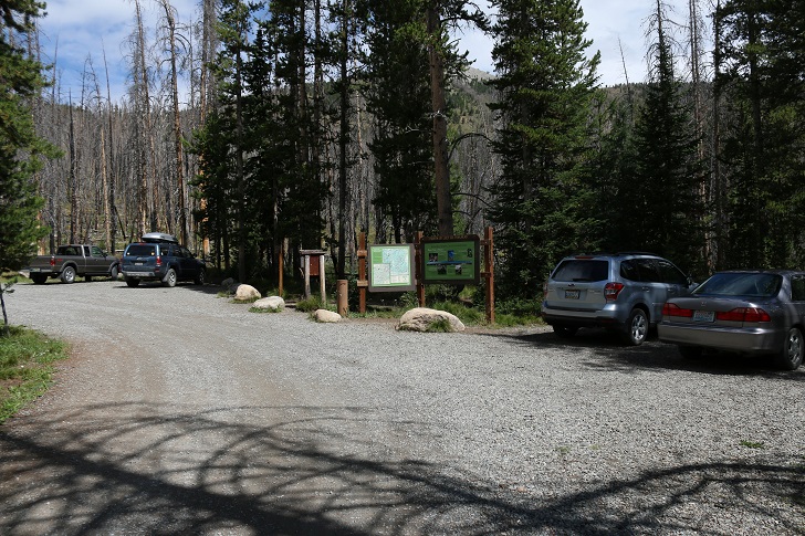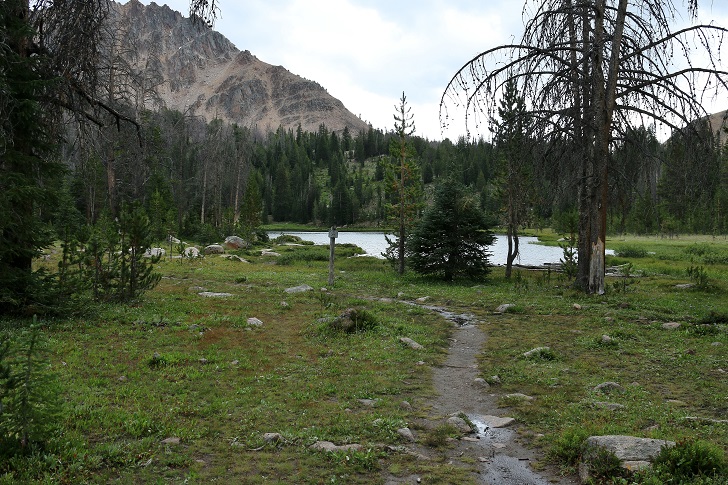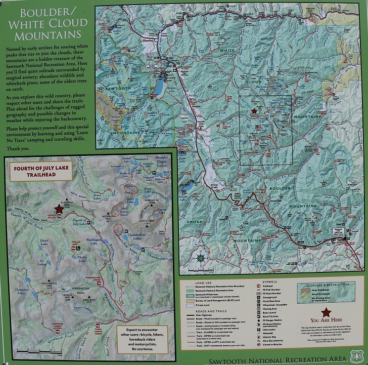 The hike to Fourth of July and Washington Lakes in the White Cloud Mountains is one of the easier hikes you'll find. It is only 6 miles round trip. I took my time stopping often for pictures and was back to base camp by mid-afternoon. I started my day leaving my base camp at Stanley Lake around 7:30 AM to drive to the the trailhead 33 miles away. The drive up Fourth of July Creek below the trailhead is rather barren as a fire ravaged this area a few years back. Luckily, there was very little fire damage on the hike route. I have posted several pictures from the trailhead. Much of the signage will have changed since I took these pictures as the White Cloud Mountains have become a "wilderness area".